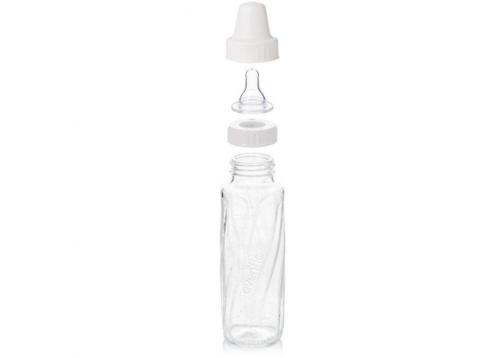 Biberón con botella twist de vidrio, mamila flujo estándar, rosca y protector clásico.